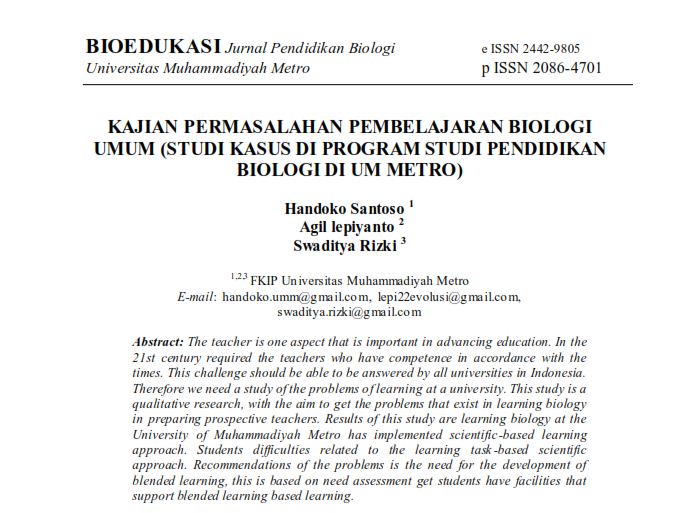 Jurnal Mipa Kajian Permasalahan Pembelajaran Biologi Umum Studi Kasus Di Program Studi Pendidikan Biologi Di Um Metro