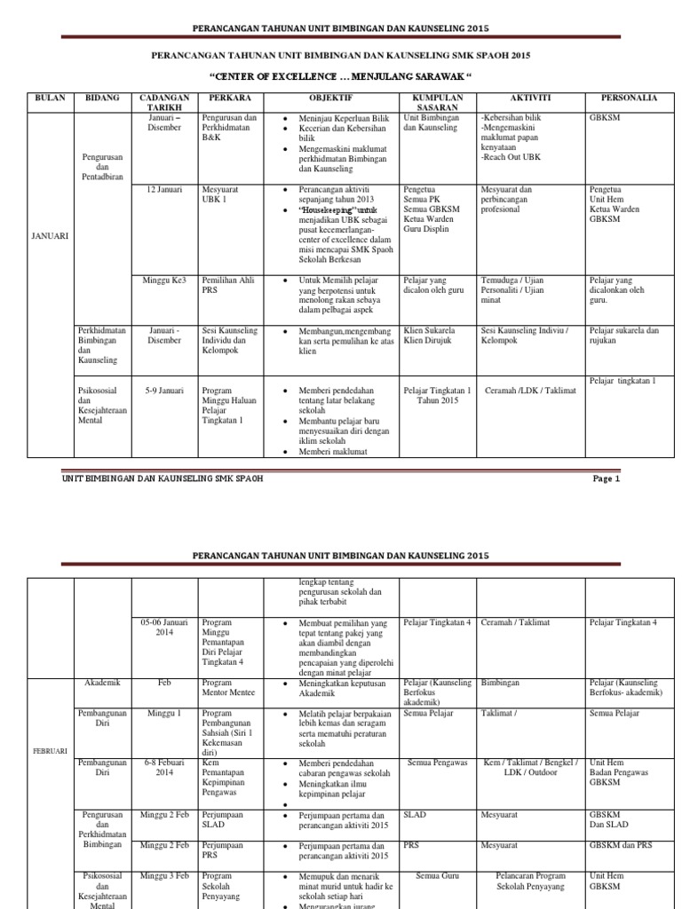 Perancangan Tahunan Unit Bimbingan Dan Kaunseling Smk Spaoh 2015