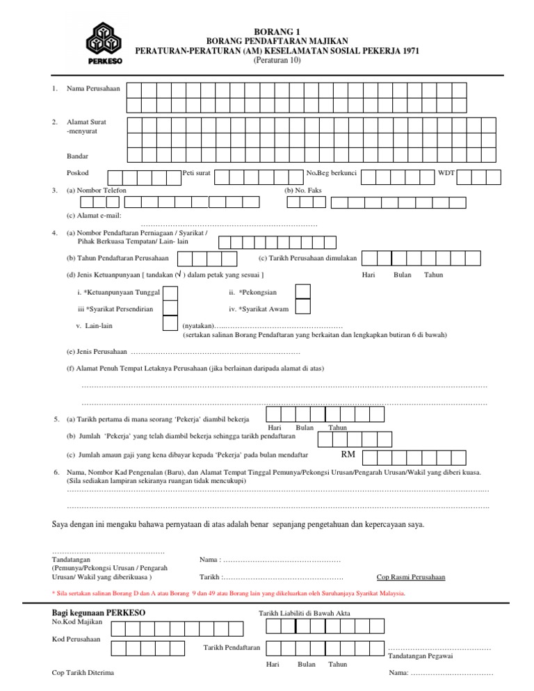 Borang 1 Pendaftaran Majikan 1 Borang Pendaftaran Majikan Peraturan Peraturan Am Keselamatan Sosial Pekerja 1971 Peraturan 10 Nombor Pendaftaran No Ssm Mycold Badan Pdf Document