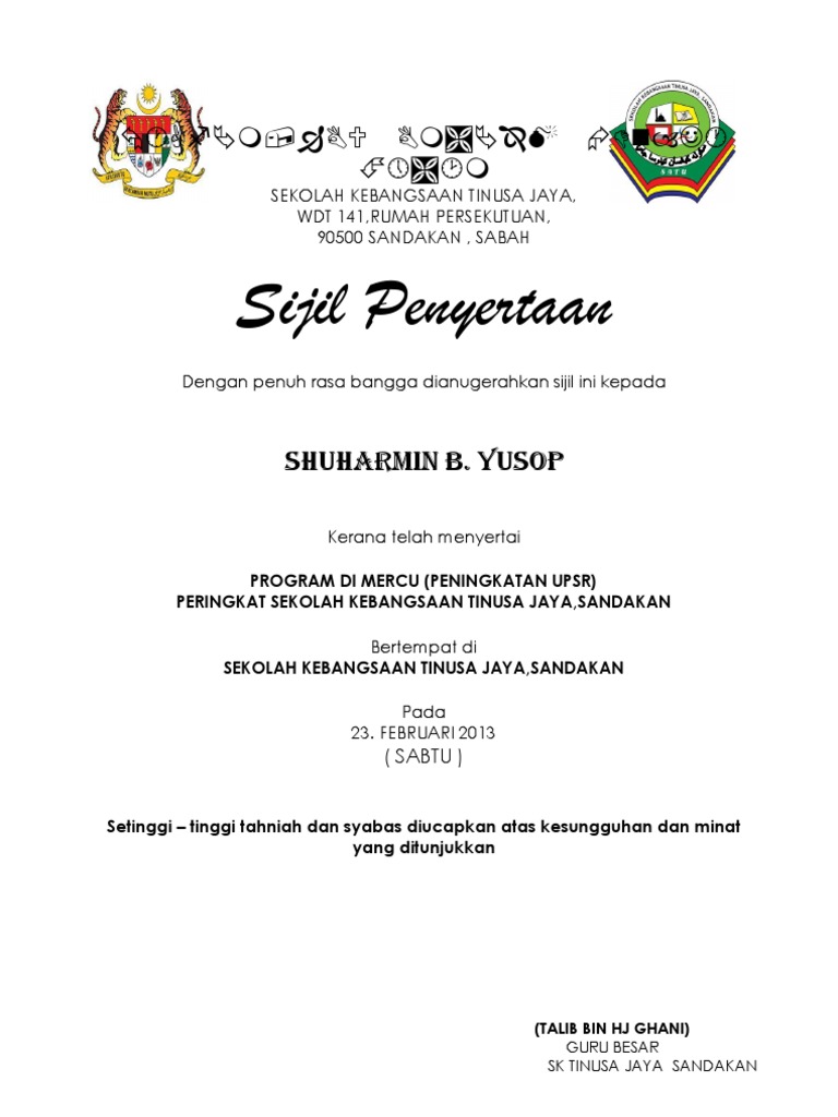 Contoh Sijil Penghargaan