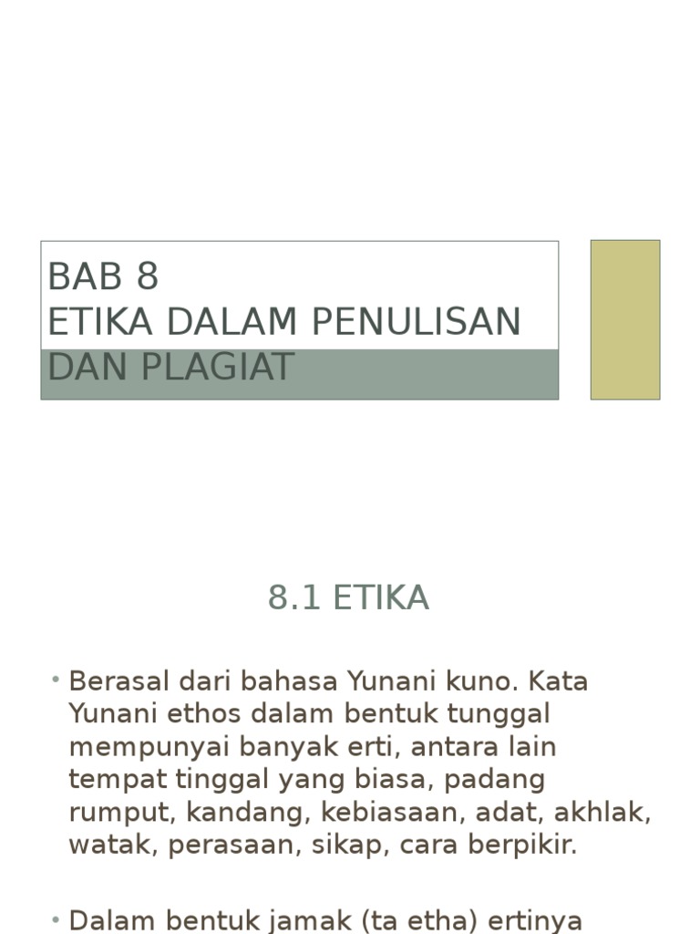 Republik indonesia nomor 17 tahun 2010 tentang pencegahan dan penanggulangan plagiat. Istilah plagiat berasal dari bahasa inggris plagiarism atau plagiary serta dalam bahasa latin plagiarius yang artinya penculik atau penjiplak. Jika kewajiban kewajiban tersebut tidak dijunjung tinggi maka penulis telah menyalahgunakan kebebasan akdemis dan ilmiah. Dari pengertian etika tersebut maka etika penulisan karya ilmiah mempelajari tentang nilai baik dan buruk tentang perbuatan penulis aturan penulisan sikap seharusnya bagi seorang penulis dsb.